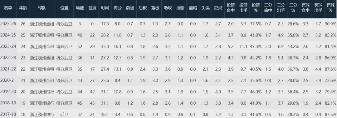 浙江队数据如下: