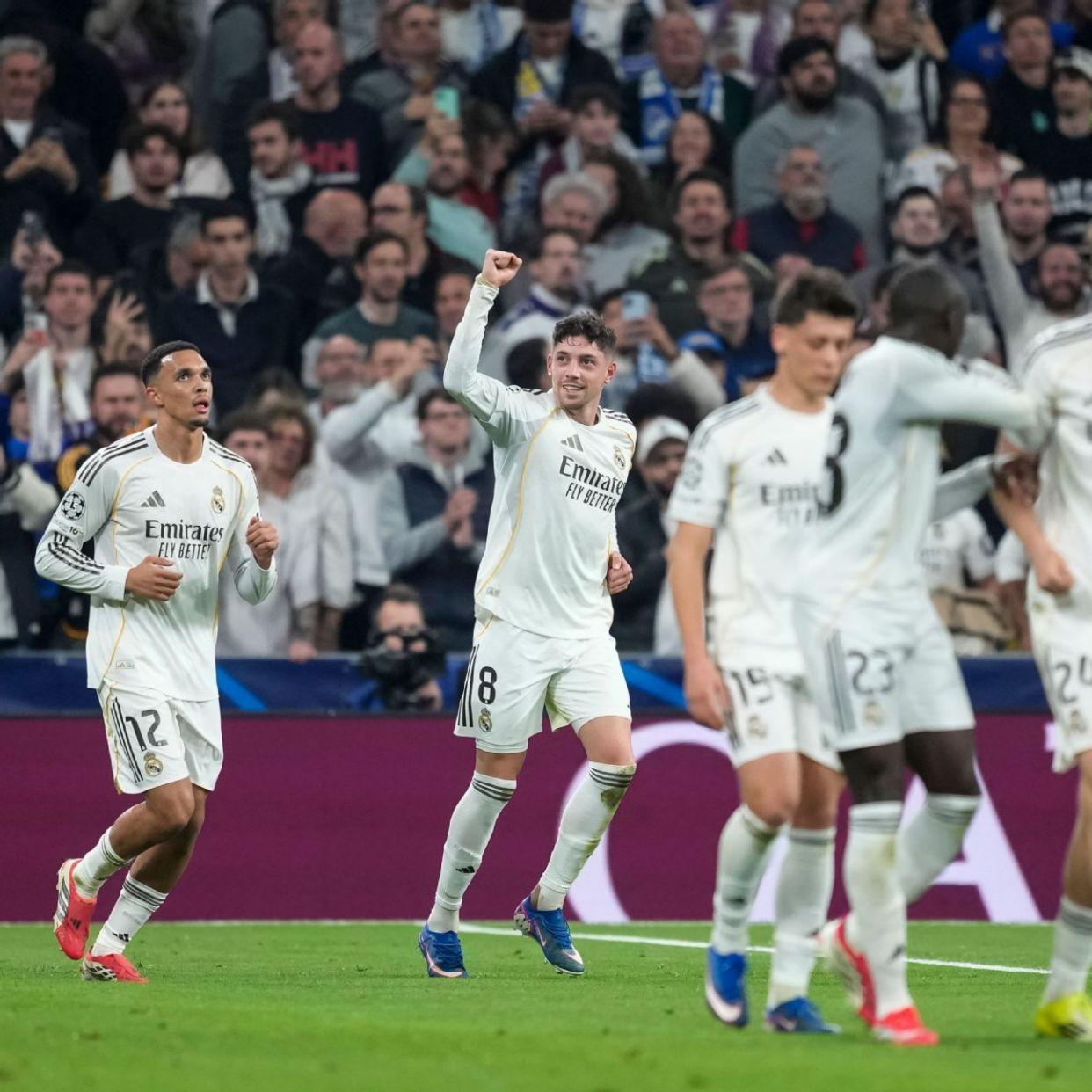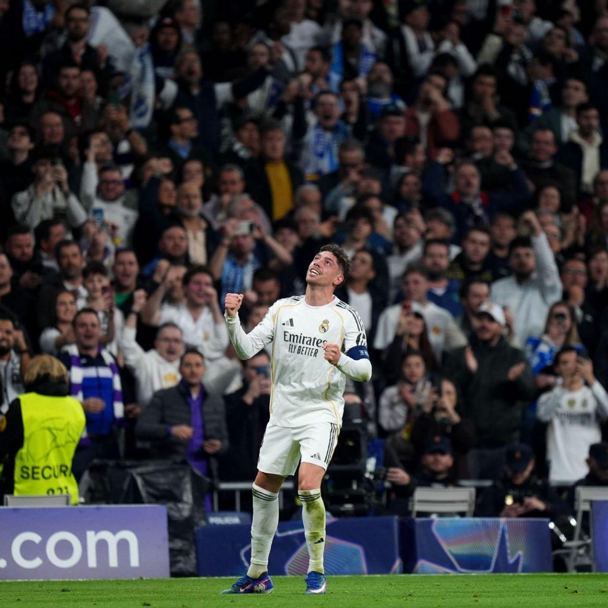 巴尔韦德在伯纳乌22分钟内完成帽子戏法,帮助皇马在欧冠1/8决赛首回合占据巨大优势。这位乌拉圭中场是皇马队史首位在欧冠上演帽子戏法的中场球员,一战将自己欧冠生涯进球数翻倍。